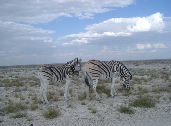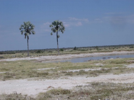 Zebra, Gnu, Springbock, Kudu, Impala, Oryx, Elefant, Giraffe und Warzenschwein, von allen gab es im Park mehr als genug. Sicher hätten wir dort auch, am richtigen Ort und zur richtigen Zeit, die Löwen aus nächster Nähe gesehen, aber das sollte nicht sein, und so werden wir wiederkommen. Stattdessen musste August am Wasserloch einen Reifen wechseln. Zum Glück boten zwei Herren aus Südafrika ihre Hilfe an und so ging es ruck zuck, was sehr wichtig war, denn im Park ist ja das Aussteigen nicht erlaubt. Insassen im sicheren Reisebus, der neben uns parkte, 'flöteten' währenddessen schadenfroh aus dem Fenster: 'Guckt doch mal die an, wechseln seelenruhig am Wasserloch den Reifen!' Was hätten wir denn für eine Alternative gehabt!? Froh, dass hilfsbereite Menschen vor Ort waren, damit der Schaden schneller behoben werden konnte, ging die Fahrt weiter zum Wasserloch 'Twee Palms'. |