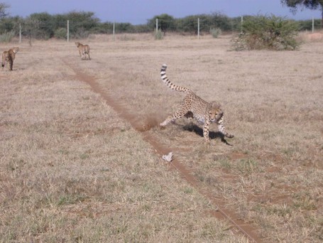 Sie erreicht man 63km südlich der Indogo Lodge auf der D2440. Dort kümmert man sich um den Schutz dieser Großkatzen und demonstriert in Form eines 'Cheetah-Run' den Bewegungsablauf dieses, mit 110 km/h, schnellsten Tieres der Welt. Dieser 'Run' wird früh am Morgen (7:30 Uhr) demonstriert und am Besten ist eine Anmeldung, die wir von der 1 ½ Stunden entfernten Indongo Lodge gemacht haben. Er funktioniert mit Hilfe einer, im Quadrat gespannten, Schnur, an die ein Lumpen befestigt wird. Diese Schnur wird von einem Motor angetrieben und dann düst der Lumpen im Quadrat davon und der Cheetha hinterher. Nachdem er den Lumpen gefangen hat gibt es ein Fresschen, als Belohnung. Eindrucksvoll kann der Bewegungsablauf beobachtet werden, und die Tiere zeigen wie sehr sie die Bewegung brauchen und gern hinter dem Lumpen herjagen. Anschließend haben wir das Museum besucht, und bei einer Tasse Kaffee, mit Blick auf das wunderschöne Waterberg Panorama, hatte dieser Besuch einen schönen Abschluss. |